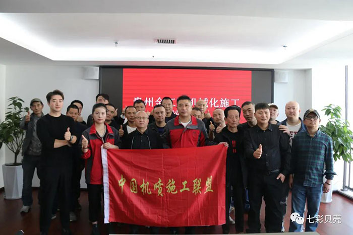 (授牌合影) 結(jié)束語 唯有把品質(zhì)和服務(wù)放在首位,才能獲得廣大消費(fèi)者的青睞。自創(chuàng)立以來,七彩貝殼堅(jiān)守質(zhì)量和服務(wù)生命線,對(duì)產(chǎn)品和服務(wù)精益求精,匠心雕琢,致力于為消費(fèi)者打造最優(yōu)質(zhì)的產(chǎn)品、提供最專業(yè)的服務(wù)。“兩工三合”機(jī)械化施工培訓(xùn)是中國機(jī)噴施工聯(lián)盟和七彩貝殼集團(tuán)在推行機(jī)械化施工道路上的一個(gè)重要舉措,也是推動(dòng)機(jī)噴施工轉(zhuǎn)型升級(jí)的關(guān)鍵。